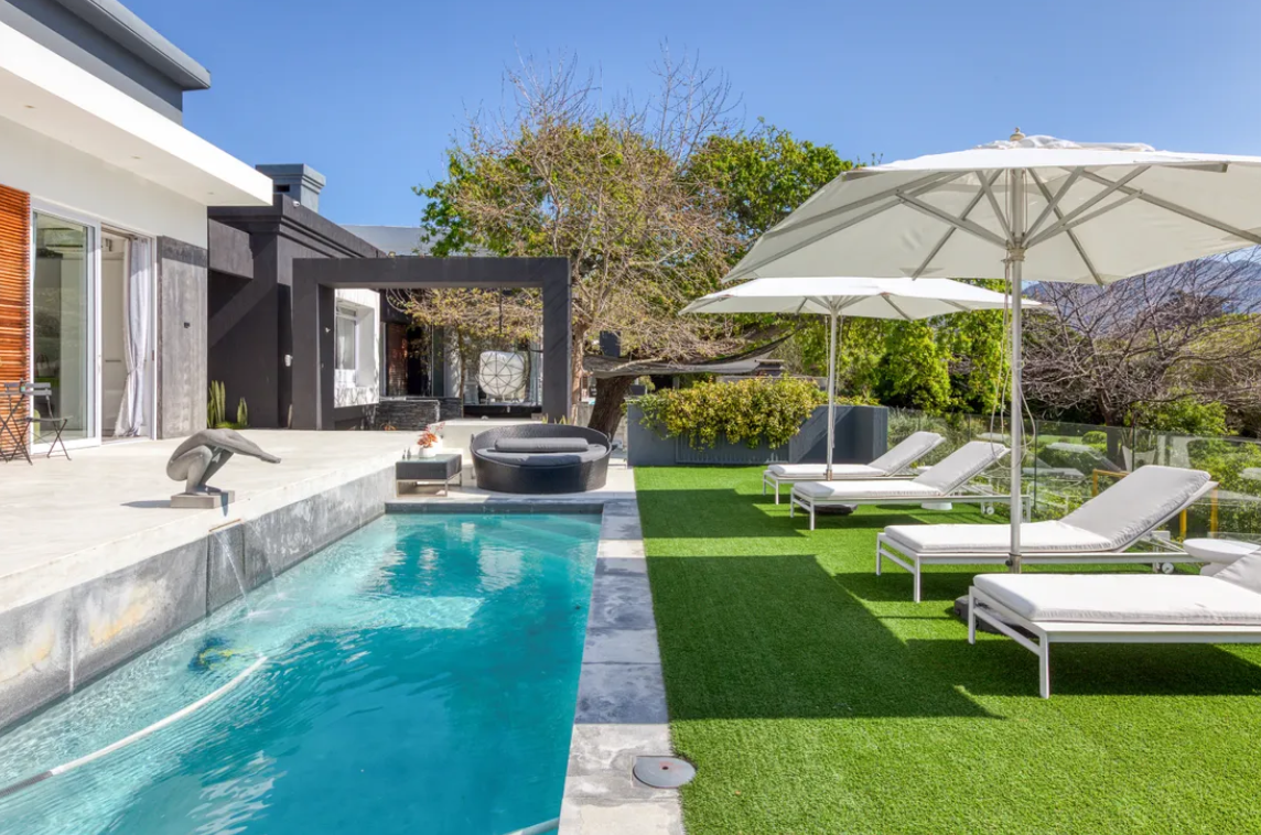 Set on 1.5 acres in Upper Constantia, this 7-bedroom masterpiece blends contemporary design with resort-style living. Surrounded by indigenous gardens and framed by mountain views, it’s as much a tranquil retreat as it is a vibrant entertainer’s dream.