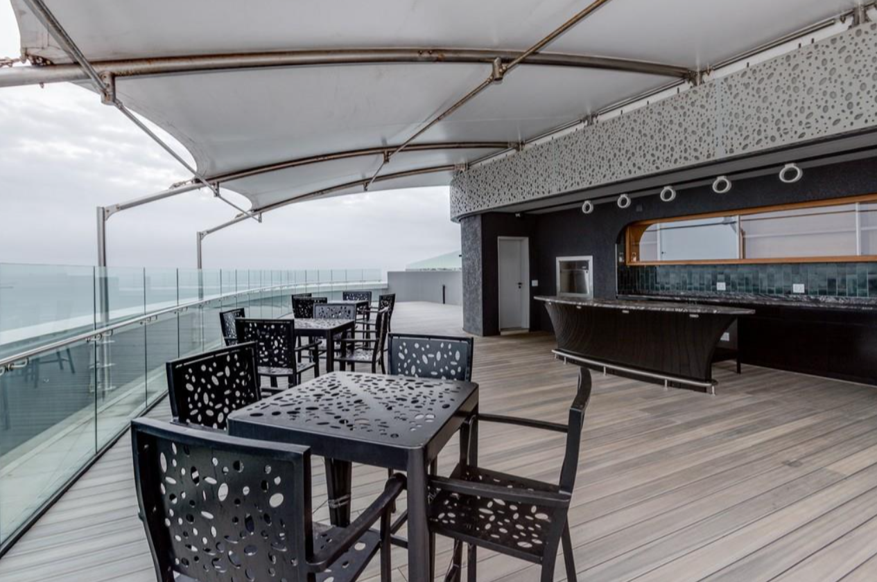 With three lavish bedrooms, each with an ensuite, and an open-plan layout, the experience culminates on the 27th floor, where a private elevator reveals a sprawling 244m2 entertainment deck enveloping a 25m2 pool. The outdoor oasis, partially sheltered by a striking white sail roof reminiscent of a luxury yacht, features a tiled kitchenette area and guest WC.