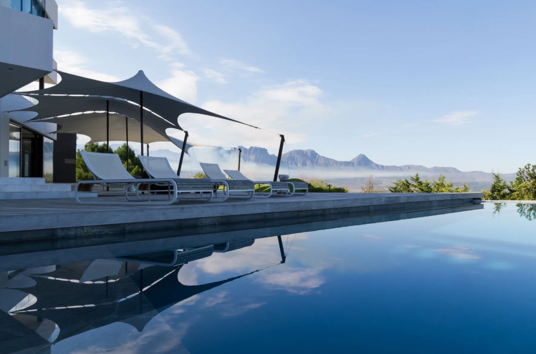 Created in 2014 and placing itself in a league of its own with striking contemporary architecture that reveals dramatic angled and curvilinear walls, windows and decks, this architect-designed, ocean-view masterpiece harmonizes with its magical setting. Perched on the side of the mountain and with panoramic views it is without doubt one of the trophy homes of the Cape but could also be the perfect boutique hotel. At approximately 2 500 Sq.m under roof the luxurious residence is situated so all bedrooms offer breath taking views, along with sitting areas, full bathrooms, fireplaces and spacious closets. There is a seamless transition between the generous outdoor living spaces and vast interior spaces that are illuminated by an abundance of windows and skylights. Situated over four levels , which are accessed by either the Fibonacci style staircase or the glass elevator, the home offers a selection of welcoming living areas, a stylish kitchen leading to its own magical enclave open to the stars, a designer wine cellar, comfortable home theater, fitness studio and massage room and a fully self-contained staff flatlet. Take the elevator to the top level, where you will find a spacious master suite with its own private pajama lounge / study all leading to a large balcony overlooking the sparkling ocean. The home offers top of the range security, home automation and complete privacy. No detail was too small in creating a home that represents only the highest standards in luxury.